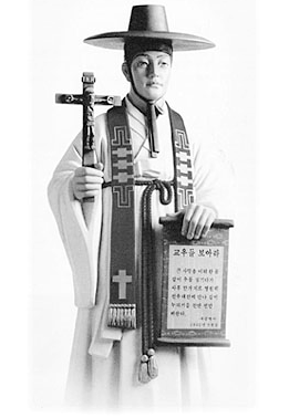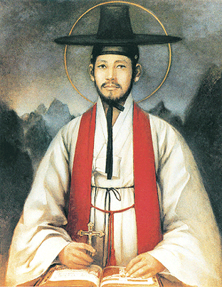 성인의 생애 (1821.8.21 ~ 1846.9.16, 축일 7. 5) 성 김대건 안드레아는 충남 당진군 솔뫼마을에서 아버지 김제준 이냐시오와 어머니 고 우르술라 사이에서 태어났다. 증조부 김진후 비오와 아버지 김제준 이냐시오도 순교로써 신앙을 증거한 신앙 깊은 순교자의 집안에서 성장한 김대건은 1836년 모방 신부에 의해 최양업 토마스와 최방제 프란치스코와 함께 마카오로 유학을 가게 되었다. 이후 사제 서품을 받고 천신만고 끝에 조선에 입국한 김대건 신부는 1846년 병오박해 때 붙잡혀 사제생활 1년 1개월만인 1846년 9월 16일에 ‘사학의 괴수’라는 죄목으로 새남터에서 군문효수형을 받고 순교하였는데 이 때 그의 나이 26세였다. 한국인 최초의 사제(司祭)요 첫 서양 학문 유학자며 조선의 문호개방과 종교자유가 민족발전에 유익하다고 역설한 선각자였던 김대건 신부는 비록 짧은 사제생활 기간이었지만 신덕(信德)과 용덕(勇德)을 겸비했던 탁월한 목자(牧者)로서 한국 교회의 모든 성직자들의 주보다. |